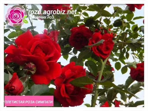 Сочетая в себе элегантные махровые цветки с высоким центром и слегка отгибающимися лепестками, диаметром около 10 см, прекрасный, насыщенный, ярко-красный цвет с темно-малиновым отливом, придающий восхитительный бархатный эффект, раннее, обильное (цветы собранны в кисти от 3 до 10 штук), непрерывное цветение, насыщенную ярко-зеленую, глянцевую листву, высокую зимостойкость, отличную устойчивость к болезням, дождям, ветрам, она по праву завоевала любовь розоводов и получила широкое распространение в садах и розариях всего мира. Высота куста розы сорта Симпатии может колебаться от 2,5 до 3,5 метров в зависимости от условий произрастания. При этом куст в диаметре достигает 2 метра. Этот сорт розы успешно используется в вертикальном озеленении как на шпалерах и стенах домов, так и на розовых дугах, а так же на таких декоративных элементах, как перголы. Не маловажно, что растение быстро растет, развивается, образуя сильные, ветвистые кусты, давая возможность достаточно быстро озеленить заданное пространство. Не малое значение при выборе этого сорта имеет отличная выносливость кустов.